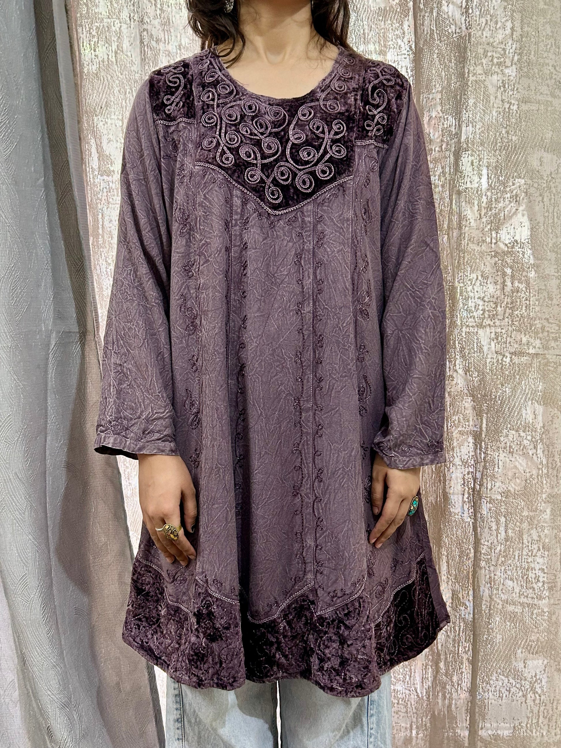 • Design: Rounded embroidered neckline with velvet yoke, full sleeves, tunic length with subtle floral accents