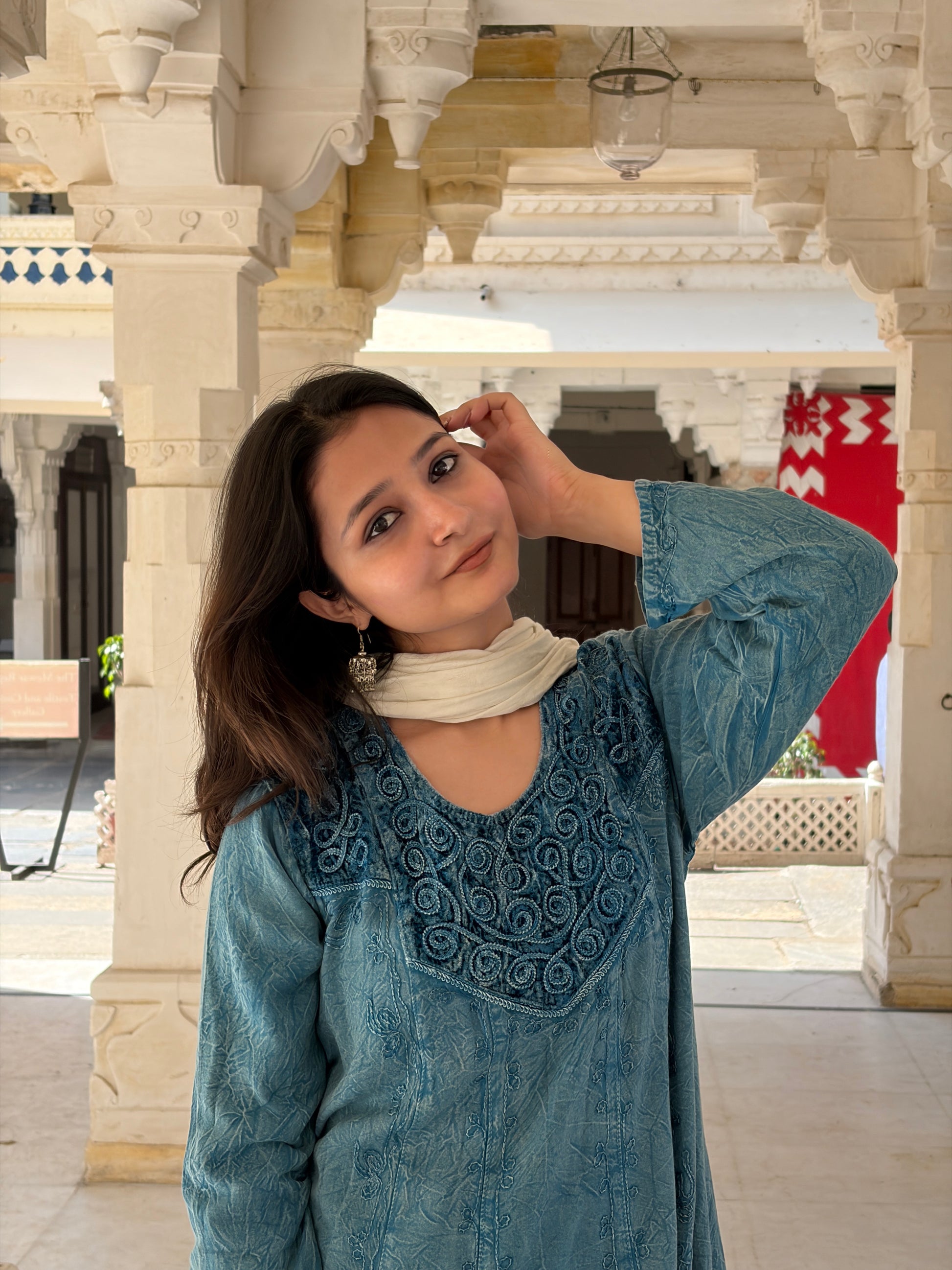 Chandra in Ocean Blue reflects serene elegance, crafted in premium rayon and detailed with hand-finished embroidery—an ode to timeless charm and everyday sophistication.”